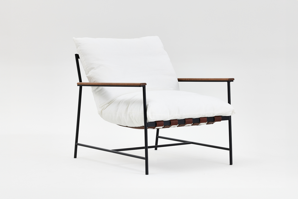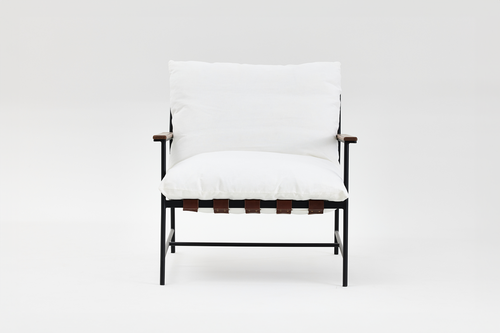 A steel frame with oak armrests, leather strapping and soft fabric upholstered on feather blend cushion.