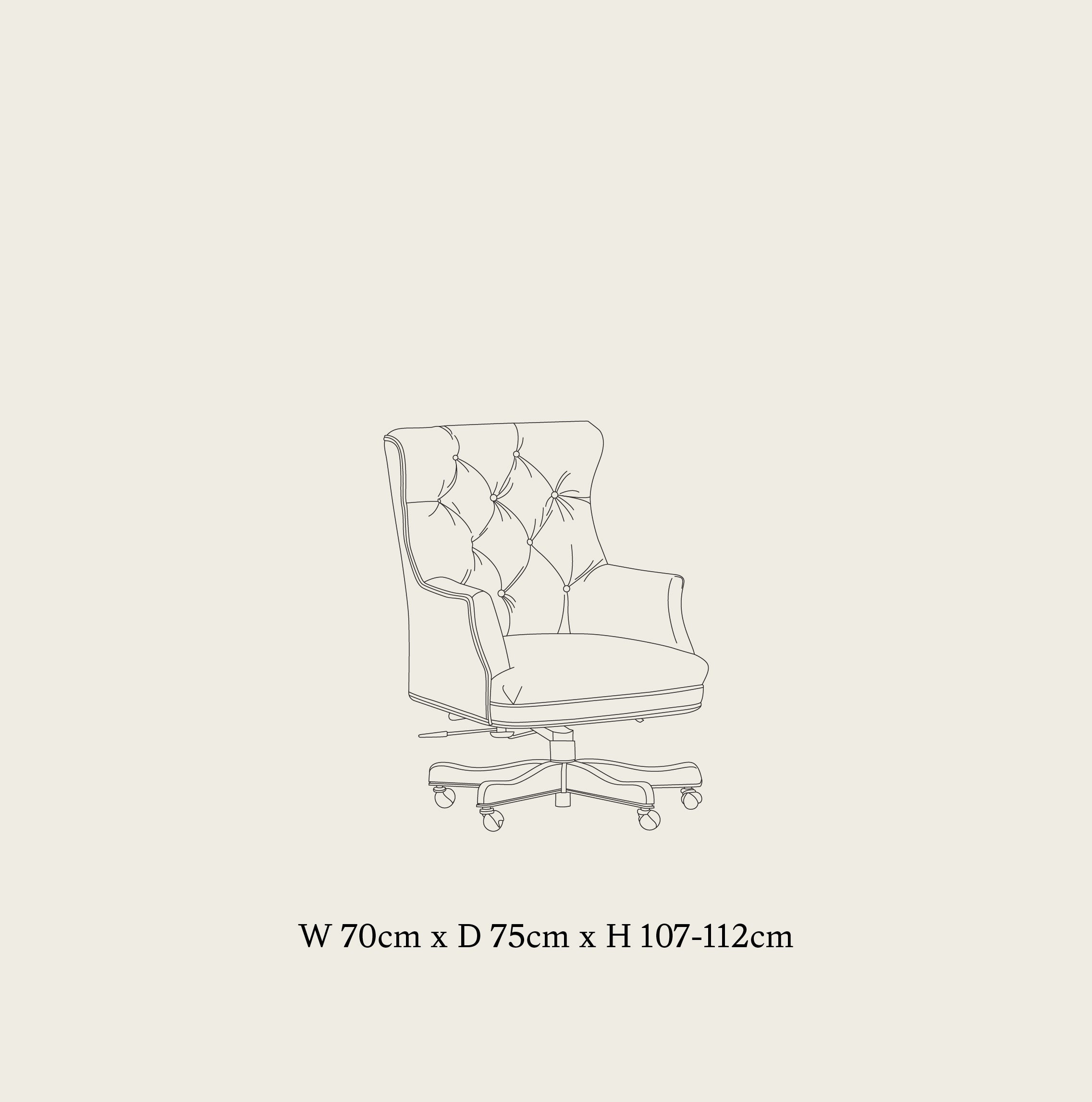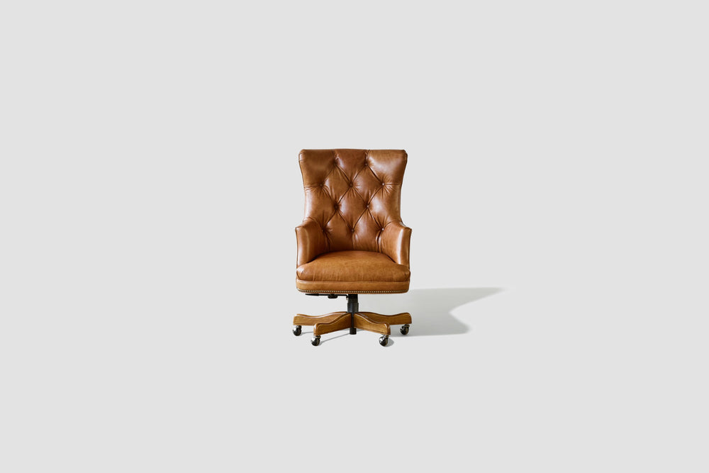 The Stewart Chair reflects the sophistication of British furniture design. Its button-tufted back and scalloped wings are complemented by a light walnut star base and Old Saddle leather, creating a warm and inviting office chair.